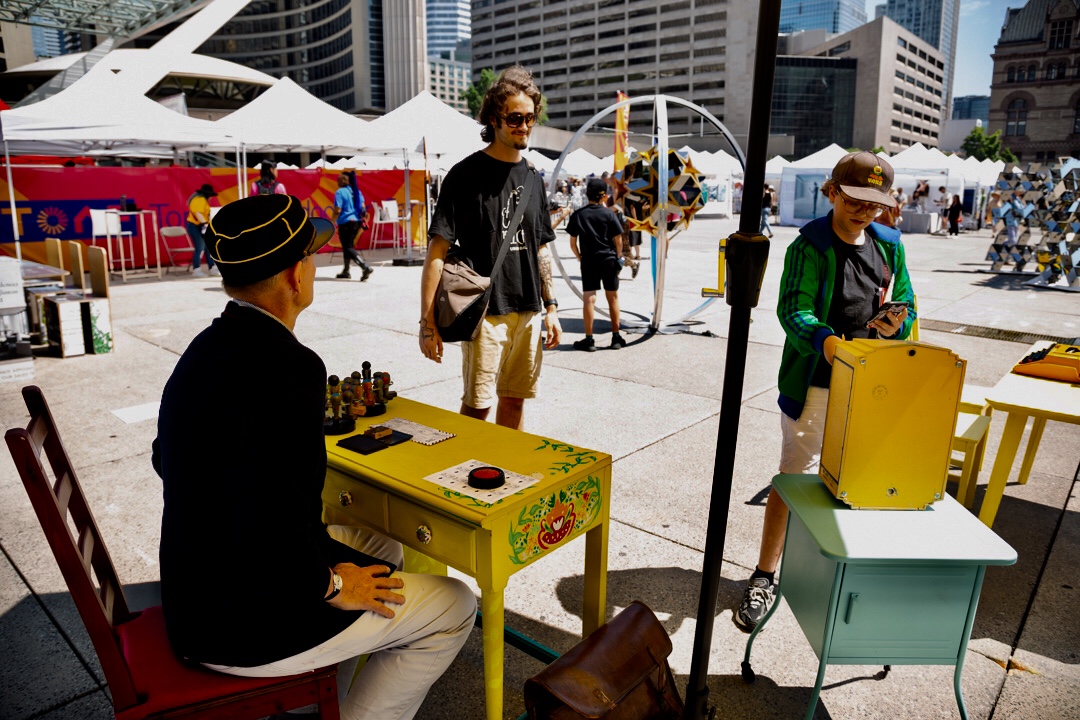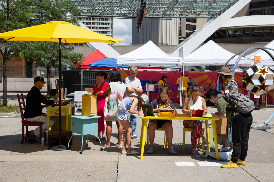 Toronto City Hall. Nathan Phillips Square Art Nest installation & performance Toronto Outdoor Art Fair 2024 July 12-14 Mini French post office, two typewriters, mailbox, rubber stamps. Mail delivery by bicycle
