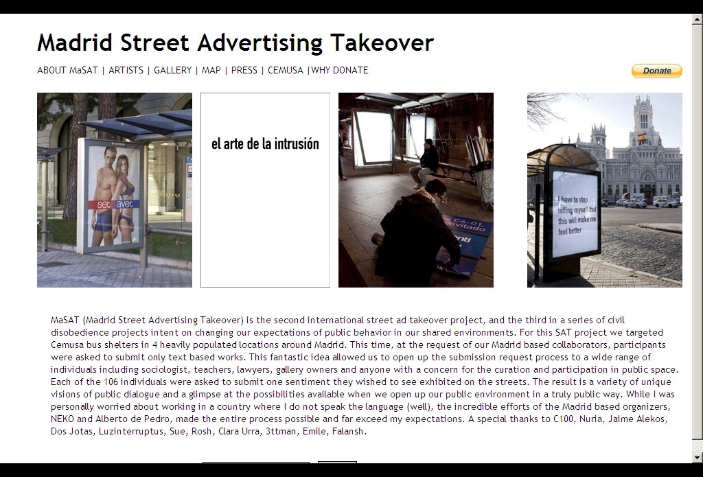 My ToSAT photo collection http://www.flickr.com/photos/martinreis/sets/72157623872858387/ Madrid Street Advertising Takeover: MaSAT http://www.publicadcampaign.com/masat/about/