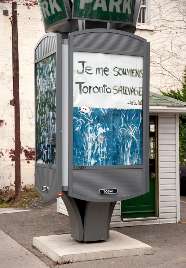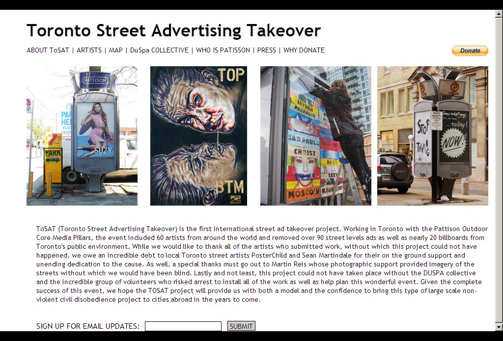 "ToSAT (Toronto Street Advertising Takeover) is the first international street ad takeover project. Working in Toronto with the Pattison Outdoor Core Media Pillars, the event included 60 artists from around the world and removed over 90 street levels ads as well as nearly 20 billboards from Toronto's public environment. While we would like to thank all of the artists who submitted work, without which this project could not have happened, we owe an incredible debt to local Toronto street artists PosterChild and Sean Martindale for their on the ground support and unending dedication to the cause. As well, a special thanks must go out to Martin Reis whose photographic support provided imagery of the streets without which we would have been blind. Lastly and not least, this project could not have taken place without the DUSPA collective and the incredible group of volunteers who risked arrest to install all of the work as well as help plan this wonderful event. Given the complete success of this event, we hope the TOSAT project will provide us with both a model and the confidence to bring this type of large scale non-violent civil disobedience project to cities abroad in the years to come." More info: http://www.publicadcampaign.com/tosat/